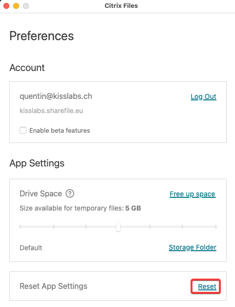 Dans ce cas, un Reset de l'application Citrix Files peut être nécessaire.