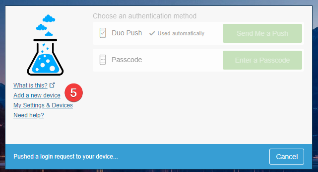 5 : Cliquez ensuite sur "Add a new device" ou "Ajouter un nouveau téléphone" et valider le Push de DUO pour accéder aux paramètres de votre compte