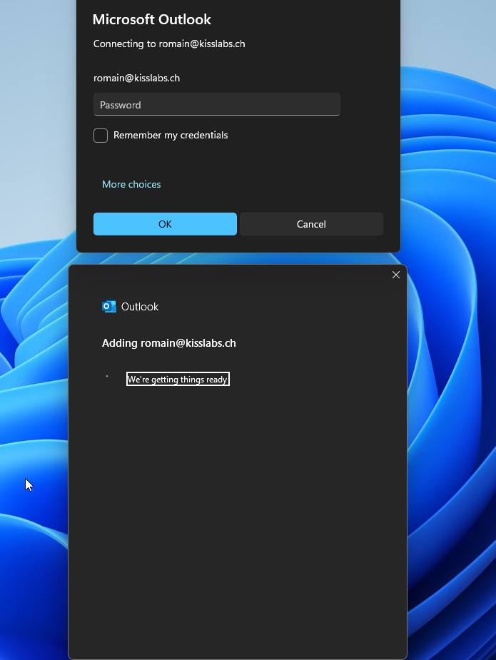 Si vous ajouterajoutez l'email : abcde@domain.youremail@domain.com, il faudra alors sélectionner "More Choice", puis saisir de nouveau abcde@domain.youremail@domain.com dans le champ utilisateur pour s'asssurer que les identifiants utilisés seront bien ceux de ce nouveau compte et non ceux du compte déjà existant
