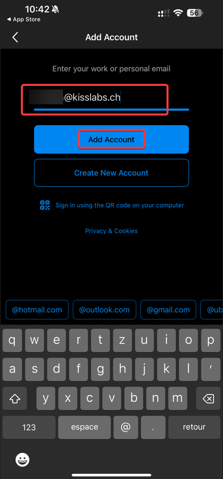 Saisir ensuite votre adresse mail du compte Exchange et cliquez sur "Add account" ou "Ajouter un compte" :