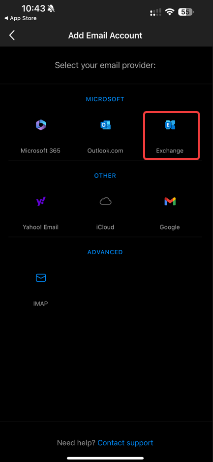 Ici il faudra toujours sélectionner le type de compte mail : Exchange :