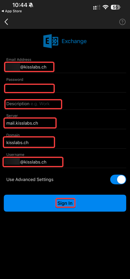 Username: youremail@yourdomain.ch ou simplement youremail (sans le domaine - Exemple si mail john@domain.com, saisir uniquement john)