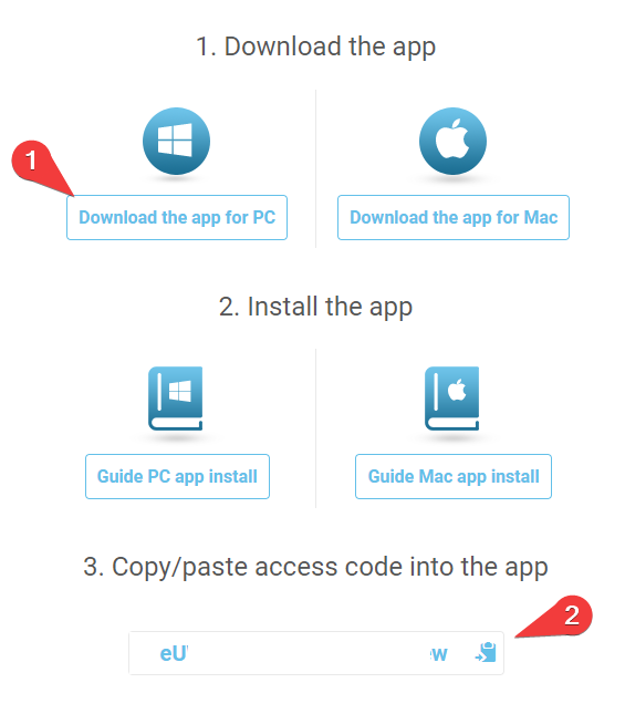 On the next step, click on "Download the app for PC" and Copy/Paste the generated code.