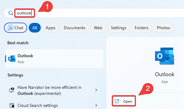 Then, search for "Outlook" and click on "Open" to launch Outlook application